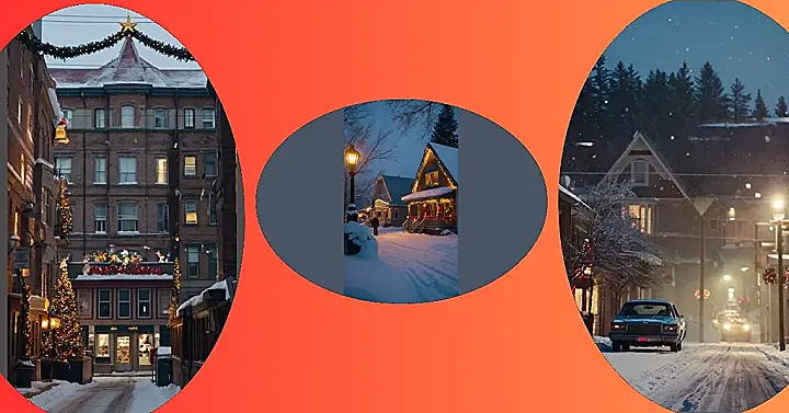 This picture is pure Christmas magic! Those giant snowflakes are seriously impressive – they’re like decorations straight out of a holiday movie. You can almost hear the sleigh bells jingling in the background! Between the snow, the vintage car (maybe Santa’s making a pit stop?), and all the sparkly lights, it’s the perfect picture of a peaceful and joyful Christmas in Canada. You can practically smell the gingerbread cookies baking inside those cozy houses!