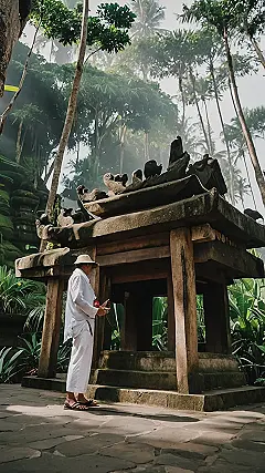 So, you want to capture the magic of Bali? Well, ditch the usual tourist traps and grab a shot like this! This picture screams peaceful vibes and mysterious temples. I mean, just look at the dude casually checking his phone in what looks like a centuries-old prayer spot. Forget posing with a Bintang beer; this is how you show off your cultured side, even if you’re secretly Googling “best nasi goreng near me.”