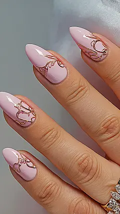 You know how some things just scream “summer fun” without even trying? Well, these nails are practically shouting it from the rooftops! With their super cute soft pink shade and those fancy gold bits that look like tiny, sparkling branches, they’re ready for any adventure. Whether you’re planning epic pool days or just chilling with your favorite snacks, these nails are basically accessorizing your hand for maximum sunshine vibes. It’s like your fingers decided to throw a fancy garden party, and everyone’s invited to stare at how fabulous they look.