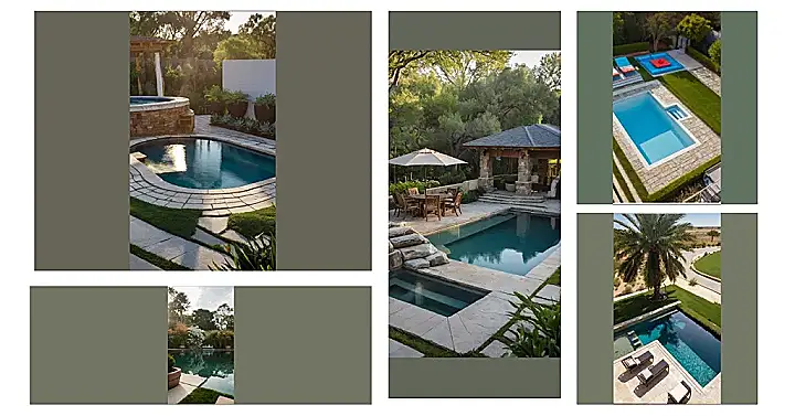 This isn’t your grandma’s pool! Look at this sparkling blue oasis – it’s like a mini-vacation in your own backyard. The cool, calming blue water is surrounded by fancy, multi-colored stone tiles that look like they’re straight out of a magazine. It’s the perfect spot to beat the summer heat and show off your amazing pool landscaping skills (or, you know, hire someone who has them!). The neat hedges and fence add a touch of elegance, creating a private paradise where you can totally relax and pretend you’re on a tropical island.