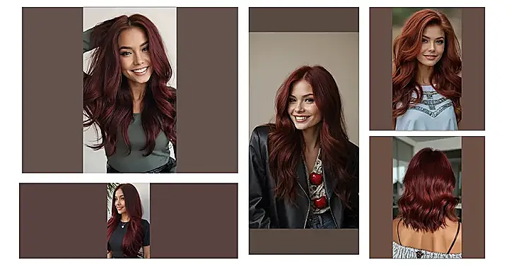 This hair color is like a sunset in a bottle! It’s got that deep, rich red that makes you think of juicy cherries, but with a hint of brown that gives it a touch of sophistication, like a fancy cherry cola. Imagine walking into a room and everyone just stopping to look at your hair – that’s what this color does! It’s totally eye-catching, but it’s still soft and flattering. Plus, if you’re feeling daring, you can even add some lighter streaks to make it pop even more.