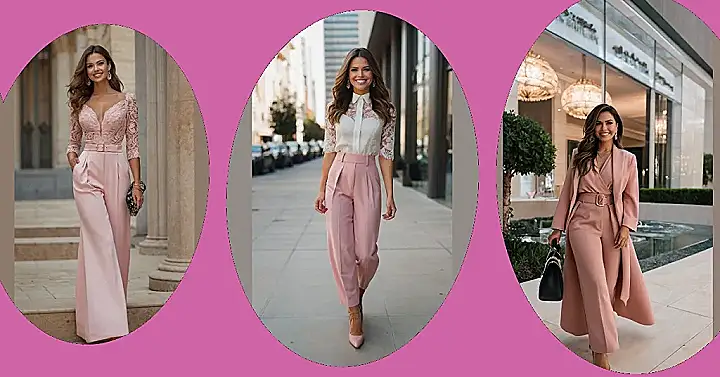 This lady is rocking a seriously chic outfit! She’s totally nailed the “pink women outfits” look with those amazing blush-colored pants. They’re like the perfect blend of comfy and classy – imagine strolling down the street feeling this confident, ready to ace that presentation or just grab some ice cream! That white lacy top is the cherry on top – super stylish but not too fussy. It’s like a grown-up version of your favourite fairy princess dress.