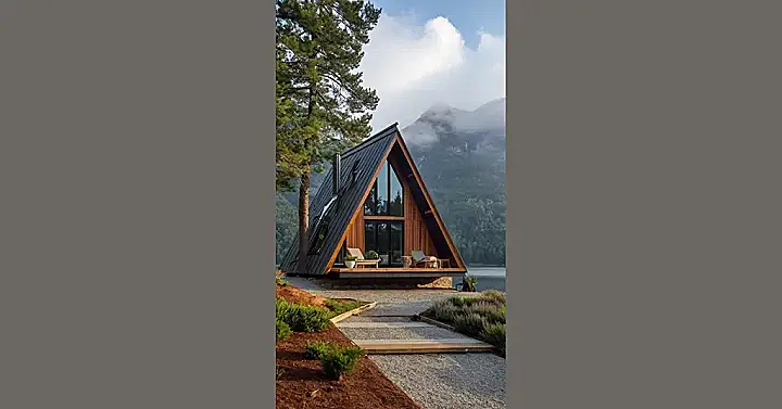 This wood house design is seriously awesome! Just look at it – a cool A-frame sitting pretty by a lake, with mountains in the background. It’s like something out of a fairytale, except instead of a grumpy old witch, you’ve got comfy chairs on the deck waiting for you to relax. Imagine sipping hot cocoa by the fire inside while watching the sunset – pure bliss! This is the kind of house that makes you want to ditch your homework and go build a fort, only, this fort is way better than any cardboard box creation.