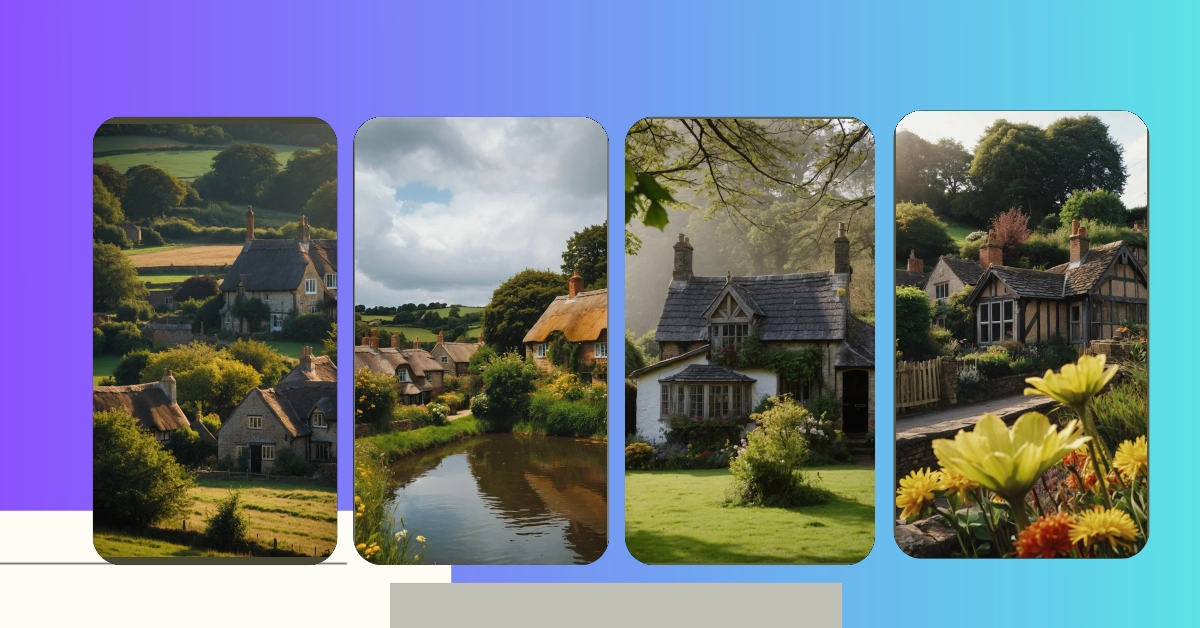 This picture makes you wish you were in a storybook! Just imagine: you’re strolling down a quiet road in an English village, the sun is warm on your face, and the air smells of freshly cut grass. The houses are cute and cozy, with thatched roofs that look like they’re straight out of a fairy tale. You can almost hear the birds singing and the sound of a gentle breeze rustling the leaves. It’s the kind of place where you can relax and forget about all your worries.