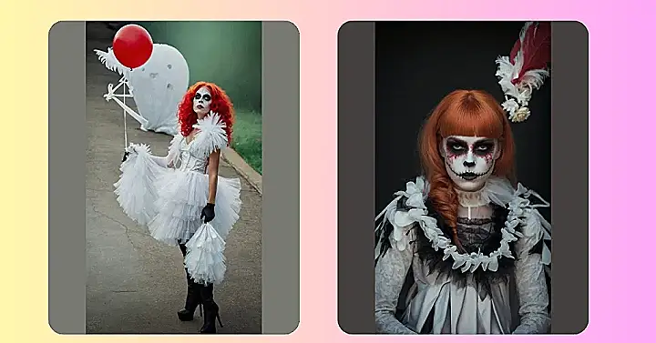 This costume is super cool and totally spooky. It’s like a mix of a doll and a skeleton, but with a really fancy touch! Imagine if your favorite doll suddenly turned into a spooky character from a scary movie! That’s what this costume is all about. The white face paint with the black lines makes it look like a scary doll, but the red accents add a little bit of gore. Plus, the whole look is made even more creepy with the beautiful black and white lace dress.