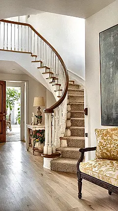 This isn’t just a staircase; it’s practically a red carpet for your daily grand entrance (or dramatic exit when you’re late for school)! Who knew a hallway could be this extra? With that fancy curved banister, you almost expect someone to slide down it, James Bond style, while the soft carpet keeps your socks safe from splinter-related emergencies. It just goes to show that even the ‘in-between’ spots in your home, like this epic entryway, are prime real estate for some serious home decorating magic. No more boring walls; it’s all about making every step feel like a style statement, even if you’re just running to grab a snack.