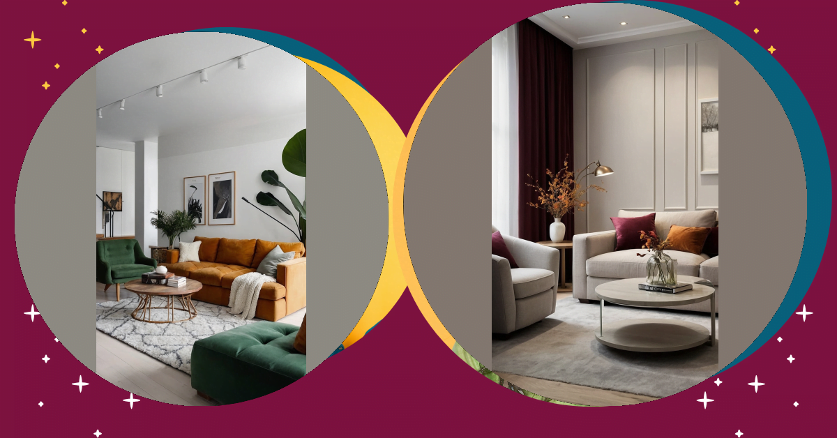 Now, picture a different living room where the color palette takes on a bolder and more contemporary approach. Vibrant hues of teal and goldenrod dance playfully with crisp black and white geometric patterns, infusing the space with a youthful energy. A sleek sectional in teal suede complements a pair of sculptural armchairs in mustard, all anchored by a monochromatic rug that ties the eclectic elements together. This modern interpretation of color palette perfection dares to push the boundaries, creating an inviting atmosphere that showcases your unique personality and design sensibilities.