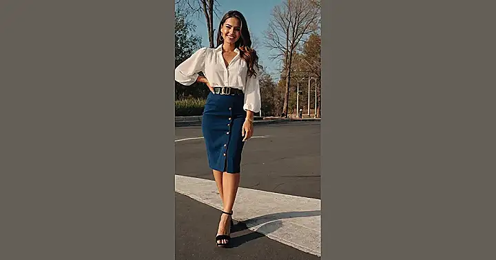 This outfit is perfect for a casual fall day, with a touch of sophistication. The white button-down shirt is a classic choice for fall, and it looks especially chic with the puff sleeves. Paired with a dark blue skirt and some stylish black heels, this outfit is ready to take on the world. The button details on the skirt add a fun pop of personality, and the belt is a nice touch that pulls the whole look together. You’ll be turning heads everywhere you go!