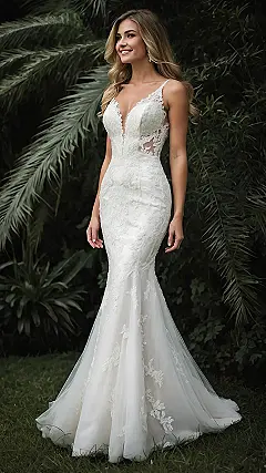 Forget about Cinderella’s glass slipper, this dress might just be the real showstopper. Looking at this gorgeous gown, you can almost hear it whispering, “I’m not just a dress, I’m an experience!” With its stunning lace details and that sleek mermaid fit, it’s basically saying, “Move over, regular clothes, there’s a new queen in town.” It’s the kind of top wedding dress that makes you wonder if it also comes with a personal spotlight and a red carpet, because anything less just wouldn’t do it justice.