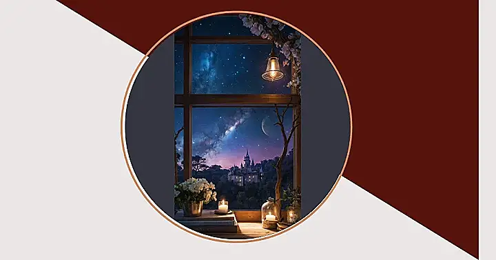Check out this absolutely epic view! It’s like the universe decided to throw a gigantic party right outside, complete with a dazzling galaxy light show, a gazillion twinkling stars, and a sleepy crescent moon just hanging out. And if that wasn’t enough to make you pinch yourself, there’s a whole fairytale castle nestled among the trees, probably where someone important is wondering if their pet dragon needs a snack. This isn’t just a window; it’s practically a portal to a land where dreams come true, but with less actual portal-jumping and more chill vibes.