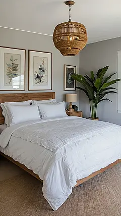 That giant woven light fixture is definitely a conversation starter, right? It’s like a super-stylish bird’s nest hanging from the ceiling, but way more useful. And with all that soft, natural light coming in, you could actually read a book in there without needing a million lamps. This is the kind of bedroom that screams “good vibes only” – perfect for a total room refresh!