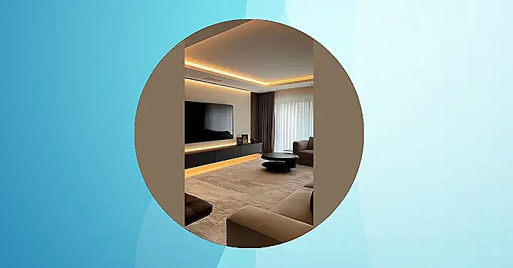 Alright, who lives here? Because this modern room is so ridiculously cool, it probably judges my own messy bedroom just by looking at it. Seriously, that massive TV isn’t just a TV; it’s practically a portal to another dimension for binge-watching. And the way those lights are hidden, glowing softly from the ceiling and under the cabinet? It’s like the room itself is whispering, “Relax, you’re in a super chill zone now,” but in a really high-tech way.