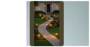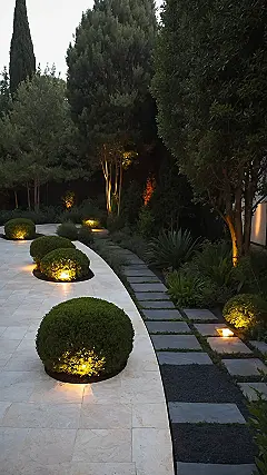Look at the main patio area, all those big, smooth rock tiles stretching out like a super-cool, easy-to-clean dance floor. They’re like the VIP section of your yard, just waiting for you to hang out on them. And those perfectly round bushes lit up? They’re like little green spotlights, maybe showing off how awesome these big rock tiles are. It’s kind of funny how these solid, silent rocks just sit there looking cool, making everything else around them, like those fancy bushes, look even better. They’re basically the chill background singers making your garden look like a superstar.