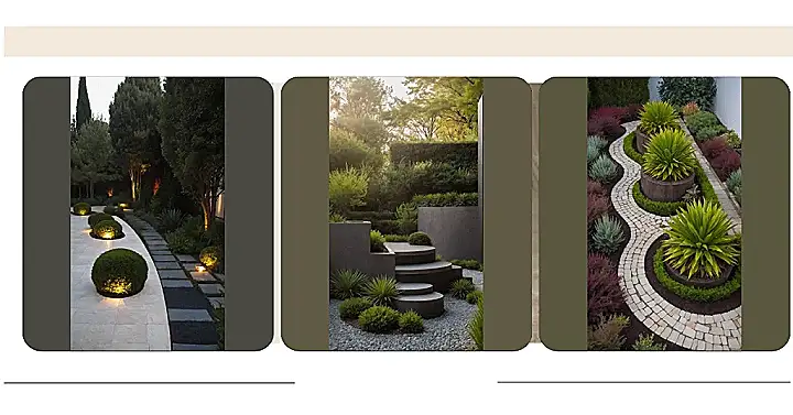 Look at the main patio area, all those big, smooth rock tiles stretching out like a super-cool, easy-to-clean dance floor. They’re like the VIP section of your yard, just waiting for you to hang out on them. And those perfectly round bushes lit up? They’re like little green spotlights, maybe showing off how awesome these big rock tiles are. It’s kind of funny how these solid, silent rocks just sit there looking cool, making everything else around them, like those fancy bushes, look even better. They’re basically the chill background singers making your garden look like a superstar.