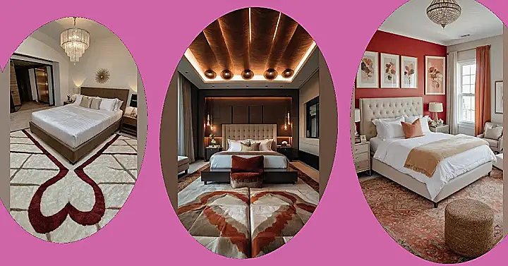 Whoa, talk about a glow-up! This bedroom is basically saying, ‘Hey, come chill here, maybe forever.’ That bed looks so comfy with its cloud-like white sheets, you might just vanish into them for a week. And can we talk about that rug? With those awesome red, heart-ish designs, it’s already got a pretty romantic vibe going on, like it’s just waiting for a movie marathon or a giant pillow fight. Plus, that super cool chandelier is probably practicing its own light show for when you decide to really crank up the romantic bedroom atmosphere.