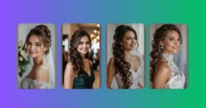 She’s got that “just married” glow, partly because of her stunning romantic wedding hair, but mostly because of that mega-watt smile! You can almost hear her thinking, “Nailed it!” as she gets ready for her big day. It’s like her hair and her smile are having a little competition to see who can sparkle more, and honestly, it’s a tie. Plus, that gorgeous lace dress and sparkling earrings complete the look so perfectly, it’s hard to imagine her stressing out about anything other than how many slices of cake she can sneak later. She’s the definition of bridal bliss, from her perfect part to her happy heart!
