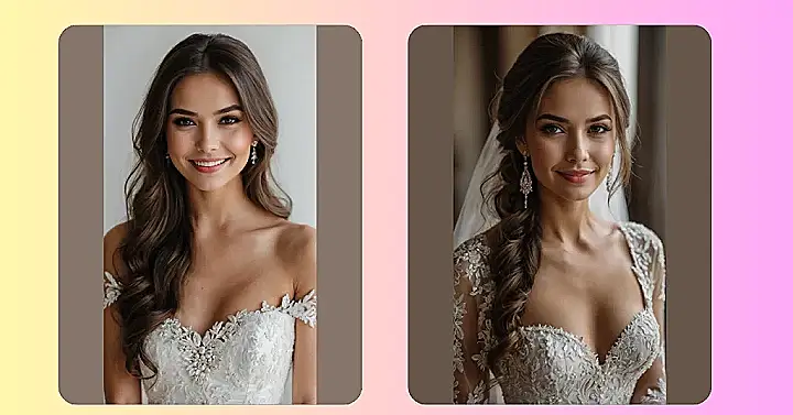 She’s got that “just married” glow, partly because of her stunning romantic wedding hair, but mostly because of that mega-watt smile! You can almost hear her thinking, “Nailed it!” as she gets ready for her big day. It’s like her hair and her smile are having a little competition to see who can sparkle more, and honestly, it’s a tie. Plus, that gorgeous lace dress and sparkling earrings complete the look so perfectly, it’s hard to imagine her stressing out about anything other than how many slices of cake she can sneak later. She’s the definition of bridal bliss, from her perfect part to her happy heart!