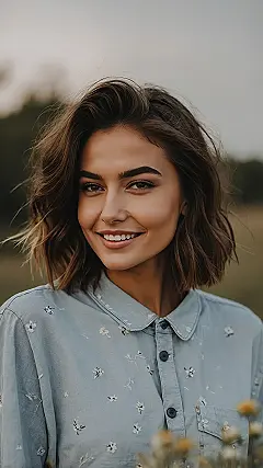 Plus, let’s be real, who needs a complex hairstyle when you can rock something this chic and carefree? Her whole vibe, from the cute floral shirt to the windswept waves, just screams “I’m having a great day, and my hair isn’t holding me back!” A shorter cut like this isn’t just about saving time on endless brushing; it’s about owning a fresh, confident look that lets your personality shine through. Get ready to feel lighter, look brighter, and maybe even get a few compliments on your amazing new ‘do – just don’t blame us if everyone suddenly wants to copy your fabulous style!