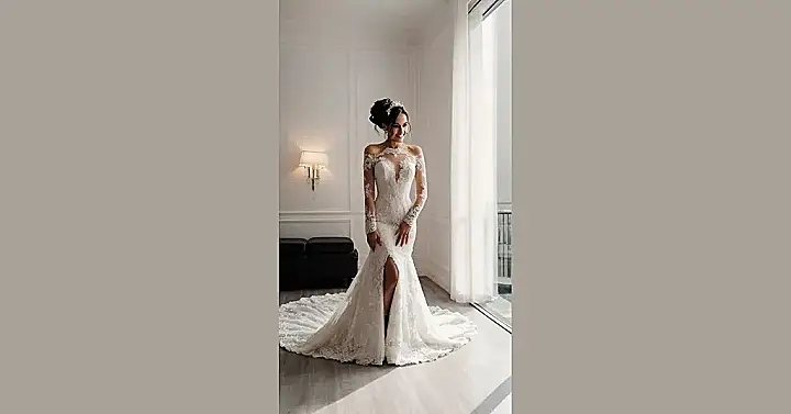Planning a wedding can be stressful, but finding the perfect gown doesn’t have to be! Check out this stunning dress for some inspiration. It has beautiful lace details, long sleeves, and a little leg-revealing slit to keep things interesting. Just imagine twirling on the dance floor in this masterpiece – maybe even tripping over the train if you’re feeling extra clumsy like me!