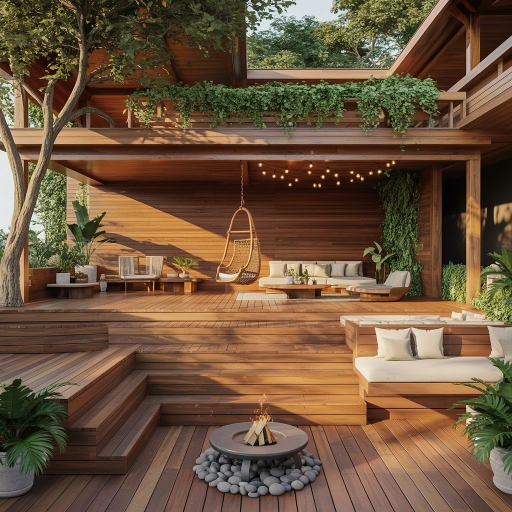 Elevate your outdoor oasis with this multi-level wooden terrace, designed for a Modern Boho Outdoor Space. Tropical foliage and a hanging rattan chair set a relaxed mood, complemented by a fire pit setup and natural timber.