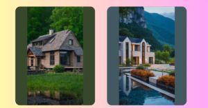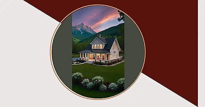 This house is like something out of a fairytale! It sits nestled among rolling green hills, with majestic mountains rising up in the background. The warm glow of the sunset paints the sky with beautiful pink and orange hues, making it look like a scene straight from a storybook. Imagine sipping hot cocoa on the porch as the sun sets, watching the stars twinkle above. This home definitely has the “dream nature home” vibes!