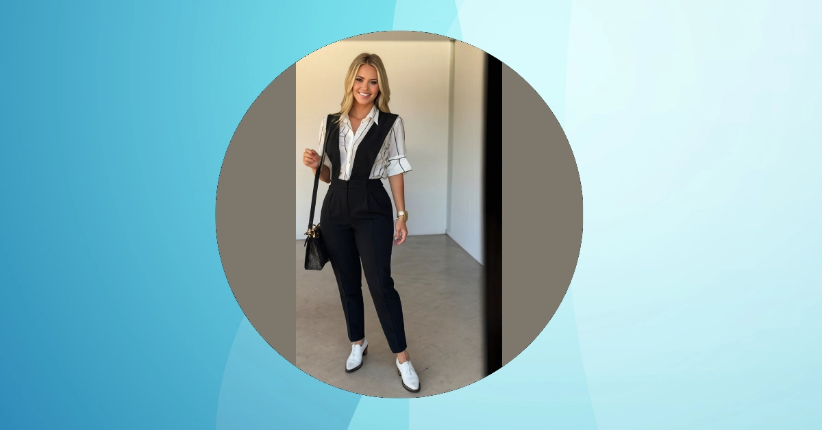 So, you wanna look professional but also comfy enough to break out into a spontaneous samba? This outfit’s got you covered! A crisp white shirt and black pants are always a good idea for work. Think business on top, but ready to party when that Friday feeling hits. And those white sneakers? Total boss move.
