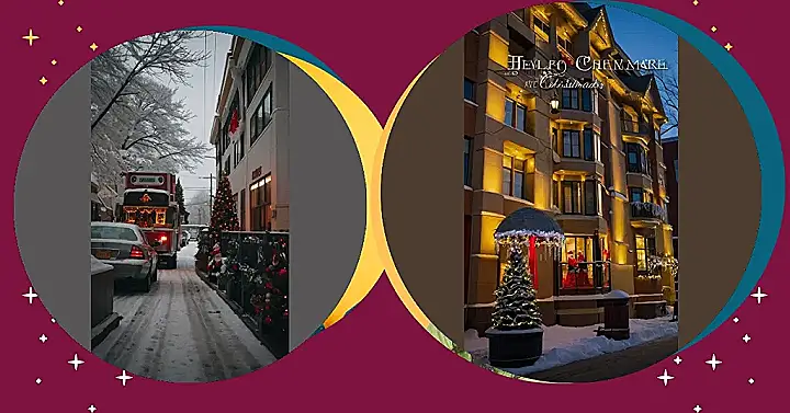 But wait, there’s more! Check out that charming street lined with beautifully decorated homes, each one trying to outdo the next with its festive cheer! It looks cozy and warm despite the winter chill, making you want to grab a hot chocolate and curl up by the fireplace. The whole scene just screams “Christmas in Canada,” full of festive magic and winter wonderland vibes. It’s enough to make even the grumpiest Grinch crack a smile – especially if that trolley bus is heading straight to a giant Christmas party!
