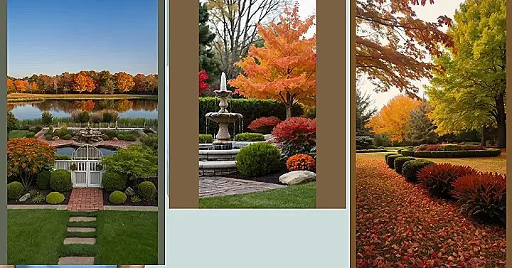 This picture is like a scene straight out of a fairytale! The fountain gurgling softly in the middle of the garden creates a peaceful vibe. The vibrant orange and red leaves on the trees and bushes are a beautiful contrast to the evergreen plants, and even the small orange flowers add a splash of color. It looks like the perfect place to relax and enjoy the crisp autumn air, don’t you think?