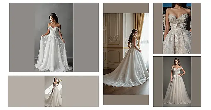 This isn’t just a dress; it’s a full-on, show-stopping event! The pretty off-the-shoulder straps and that intricate lace bodice are seriously giving ‘glam queen’ vibes. And with a waistline that’s perfectly sculpted, much like a stylish Basque waist, you might even forget you just ate two slices of wedding cake! Plus, think of the endless twirls you could do in that magnificent skirt – just try not to accidentally sweep up any small relatives on your way to the dance floor!