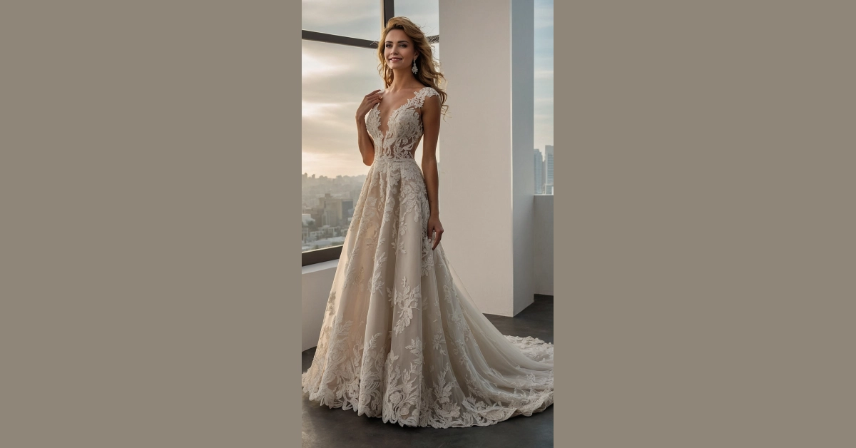 Seriously, check out that neckline! It’s daring and dreamy all at once. This is not your grandma’s wedding dress—it’s totally chic and perfectly captures the “new bridal dress designs” vibe. You could totally rock this look whether you’re getting married in a castle or a cool city rooftop—and hey, maybe even get some awesome photos with a cityscape in the background, just like in the picture!