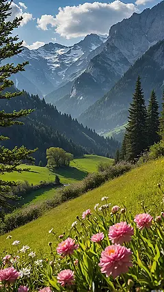 Tired of looking at the same old boring screen every day? This pretty HD picture is here to rescue your eyes from dullness! Look at those majestic mountains looking all important, the green valley shimmering like a secret level in a video game, and those bright pink flowers just chilling, looking fabulous. Slap this wallpaper on your device, and suddenly, even checking your math homework might feel a tiny bit more epic. It’s like giving your phone a superhero cape of awesome views.