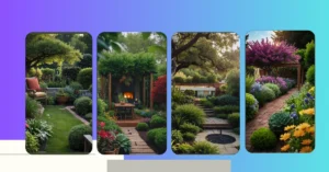 Plush cushions in calming hues invite you to sink into the comfortable seating, a perfect spot for reading your favorite book or simply taking in the beauty of the surrounding garden. The soft glow of string lights overhead creates a magical ambiance, ideal for enjoying evening gatherings with loved ones. Whether you’re seeking a quiet refuge for introspection or a charming setting for lively conversations, this screened porch with its carefully curated layout offers the perfect escape for any mood or occasion.