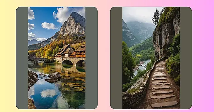 Forget binge-watching travel shows, Europe’s natural spots are way more dramatic in real life. Take this place, for example. You’ve got a mountain looking like it just finished a serious gym session, trees showing off all the best autumn colors, and a river that’s so clear you can probably see the rocks judging your life choices from the bottom. And look at those buildings casually sitting right on the bridge! It’s like they wanted the ultimate waterfront property, but also the best view of the mountains. European nature definitely knows how to put on a show, sometimes with charming old buildings as co-stars.