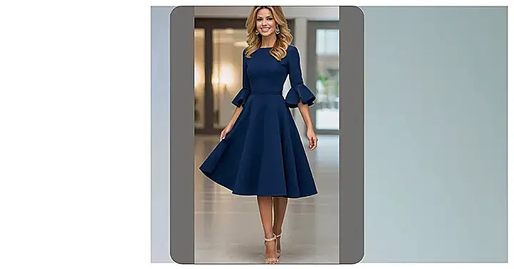 The image shows a woman looking absolutely fabulous in a stunning navy blue dress with a touch of elegance. The dress is perfect for any special occasion, from a fancy dinner to a wedding. It’s like a superhero costume for a girl who wants to feel confident and beautiful!
