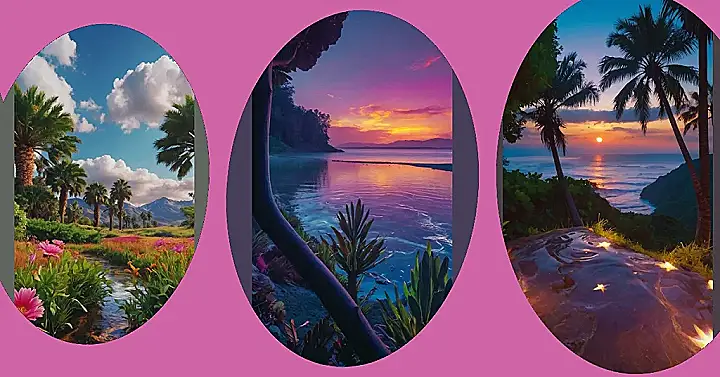 This picture is like a postcard from a dream vacation! The sky is painted with a mix of pink and purple, like someone spilled a giant bucket of colorful paint across the clouds. It’s so beautiful, you almost expect a rainbow to pop out from behind the palm tree! The ocean looks calm and peaceful, perfect for a relaxing dip after a day of exploring. You can almost feel the warm breeze and hear the gentle waves lapping against the shore.