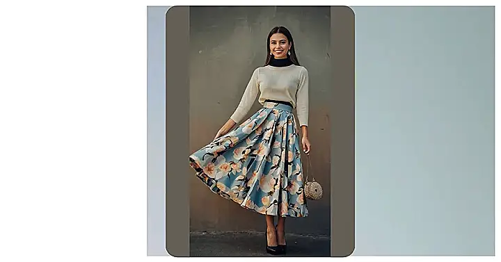This outfit is like a breath of fresh air – seriously, look at that gorgeous floral skirt! It’s like a garden party exploded onto fabric. And the way it flows? It’s basically begging you to twirl like a ballerina in a meadow. The sweater is cozy and chic, like a hug from your favorite grandma, but with way more style.