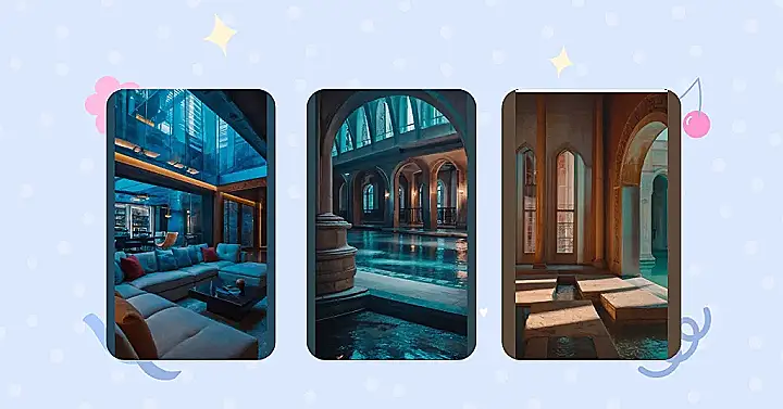 The architecture of this place is really cool! It reminds me of a castle, but with a more modern feel. Those arched doorways and the smooth stone walls make it look like something out of a fantasy movie. And the way the light shines through the windows and on the water makes it feel super peaceful. If I could actually be in that room, I’d probably just sit there and let my mind wander. It’s the perfect place to daydream and let your creativity flow. I’m sure a lot of amazing ideas would come to me if I could spend some time in this dreamy building.