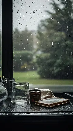 Seriously, though, doesn’t this just scream “relaxation”? The rain outside makes the inside feel extra cozy and peaceful. That little notebook is just begging to be filled with a story or poem inspired by the view, perhaps a tale of brave raindrops racing each other to the ground. I bet it smells amazing in there too – like rain, wet earth, and maybe that delicious-looking stuff in the tin. Definitely a mood.