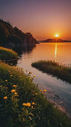It’s easy to imagine being there, feeling the cool evening breeze on your face and hearing the gentle lapping of the water against the shore. You might even be able to smell the wildflowers, like the yellow ones in the foreground of the picture. Even though the sun is setting, it’s not really a sad moment, it’s more like a peaceful goodbye. Just like the sun will rise again tomorrow, new adventures and beautiful moments are waiting to be discovered!