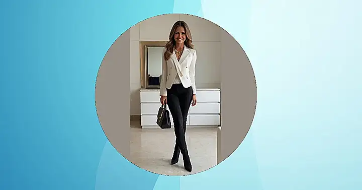 This outfit is perfect for when you want to look effortlessly stylish, even if you’re just grabbing coffee with your friends. Imagine this: you’re totally owning your day, rocking those black pants and a crisp white blazer that screams confidence. It’s like a superhero costume, but instead of saving the world, you’re saving time and looking amazing while doing it! The boots add a touch of sophistication – because why not? You deserve to feel like a million bucks, even when it’s just another Tuesday.