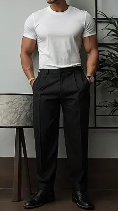 The image shows a guy rocking a timeless outfit that screams “classic.” He’s got on a crisp white t-shirt and sleek black pants. It’s a look that’s clean, sophisticated, and never goes out of style. Think about it: you could put this guy in a time machine and he’d fit right in, whether it’s the 50s, 80s, or even today. And the best part? You probably already have these pieces in your closet.