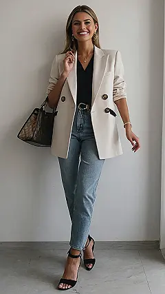 This outfit is the ultimate “I woke up like this” look, but way cooler. Forget struggling with complicated layers! This simple combo of a creamy blazer, a comfy black top, and some light-wash jeans screams effortless style. It’s like the perfect blend of comfy pajamas and super stylish, ready for anything from a coffee date to a chill afternoon with friends. Plus, the black heels add a touch of grown-up sophistication – because even casual can be glam!
