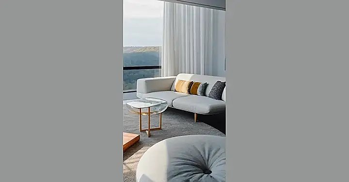 This living room is so bright and airy, it almost feels like you’re floating on a cloud! With its big, open windows letting in lots of sunshine and a unique, modern design, this space is all about kicking back and relaxing. Imagine curling up on a comfy couch with a good book, maybe sipping on a warm beverage, and enjoying the beautiful views.