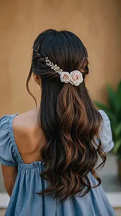 Let’s be real, sometimes doing your hair feels like trying to solve a Rubik’s Cube blindfolded while riding a unicycle. You want to look cute, but who has hours to spend twisting, pinning, and maybe crying a little? Good news! The picture shows off the ultimate hair hack: the pretty simple half-up style. It’s like the hairstyle version of putting on sunglasses when you haven’t slept – instantly cooler, but takes zero brain power. Just grab a bit from the front, pin it back with something cute (like that sparkly clip!), and suddenly you look way more put-together than you feel.