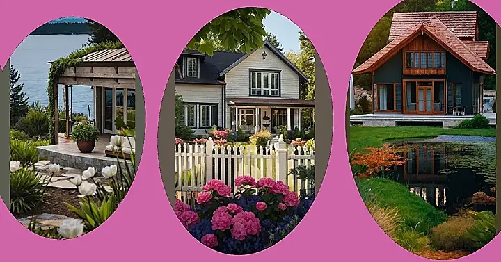 This house is so pretty, it’s like a picture from a fairytale! It’s got a white picket fence that looks like it could belong in a storybook, and a porch that’s just begging for you to sit down and relax with a glass of lemonade. And let’s not forget the flowers! They’re absolutely gorgeous – imagine the amazing scent! It’s like the house is wearing a beautiful pink and blue flower crown.