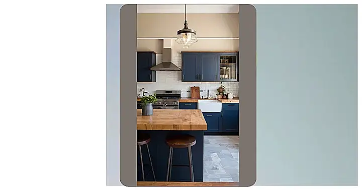 This kitchen is like a scene straight out of a magazine! It’s got all the cool colors and modern touches that would make any chef (or even just a snack enthusiast) super happy. The blue cabinets are like something out of a fancy restaurant, but the wood countertops and bar stools bring a cozy and inviting vibe. You can almost imagine yourself whipping up a feast in this space and then enjoying it with friends under the warm glow of the hanging light!