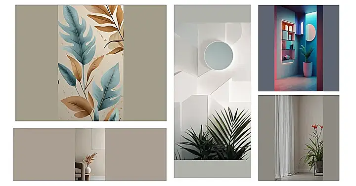 Check out this wallpaper – it’s so minimalist, it’s practically hiding! All those geometric shapes look like a super-secret spy headquarters for plants. Maybe the green leaves are planning a takeover of your bedroom, but at least they’re doing it in style with that classy blue circle hanging above them.