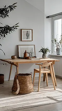 The image shows a Scandinavian home decor style that’s all about simple elegance and natural elements. It’s like stepping into a peaceful oasis, with light wood furniture that’s smooth as silk and a giant woven basket that’s begging you to throw all your worries inside! The picture makes you want to curl up with a good book and a steaming cup of tea, maybe even a little bit of cinnamon for an extra dose of hygge!