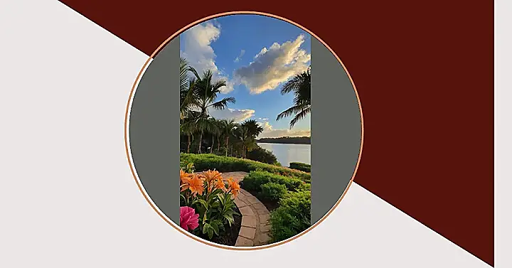This picture makes me want to pack my bags and head to a tropical paradise! Just imagine yourself strolling down that stone path, the warm sun on your face and the gentle breeze rustling the palm trees. The flowers are bursting with color, adding a splash of cheer to the already beautiful scene. You can almost hear the waves crashing softly on the shore in the distance, inviting you to take a dip in the crystal-clear water.