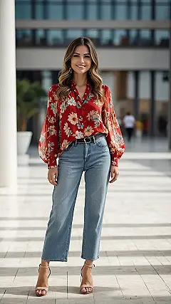 Wearing a floral blouse like this is basically telling the world, “Hey, I brought the garden party with me!” It’s like you’ve got a whole field of flowers just chilling on your shirt, ready to brighten everyone’s day, especially your own. Pairing it with jeans keeps it super chill and comfortable, proving you can look this good without having to wear anything stuffy. It’s the perfect combo for when you want to feel sunny, even if it’s raining and all the real flowers are looking a bit soggy.